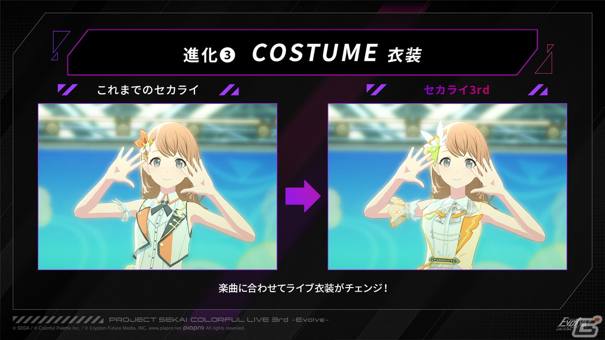 最後の進化ポイントとして紹介されたのは衣装について。今回から楽曲に合わせて毎回ライブ衣装がチェンジするという。メンバーがどんな衣装を着てパフォーマンスするのかが楽しみなところ。