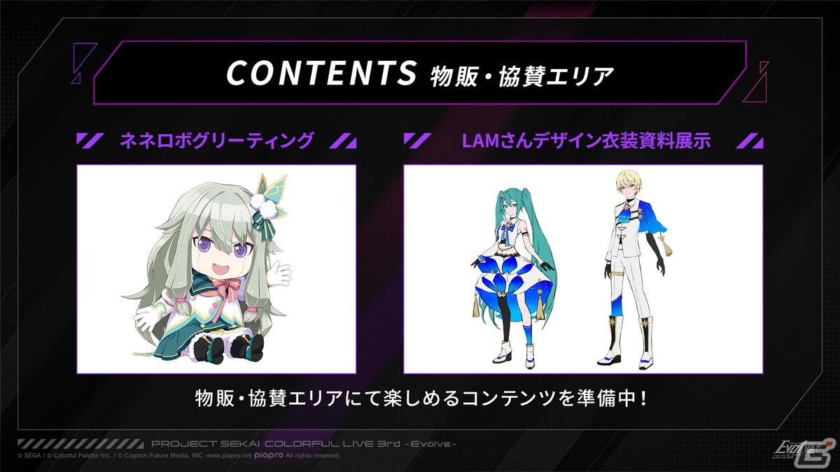 また、会場の物販・協賛エリアの情報が公開。ネネロボ着ぐるみグリーティングや、LAMさんデザインの衣装資料の展示がエリアに登場。ネネロボグリーティングは、登場するタイミングがあり、事前に登場時間が公開されるとのこと。また、写真撮影もOKで、今回3周年の衣装を着用して登場するそうだ。