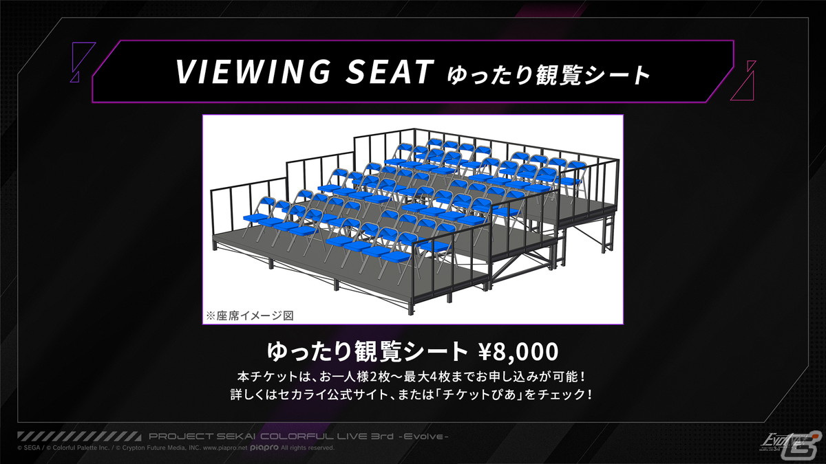 「ゆったり観覧シート」は座ってライブを楽しめる座席となり、お子さんなど身長の低い人や、ライブをゆったり楽しみたい人におすすめのシートになっているとのこと。価格は8,000円で、応募が一人につき2枚からとなる。
