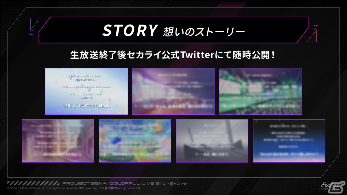 まずは「プロジェクトセカイ COLORFUL LIVE(以下、セカライ)」がどういうステージなのかを紹介。また、それぞれのセカイからステージへと繋がる「想いのストーリー」が全7話、セカライ公式X(Twitter)から公開されていく予定とのこと。