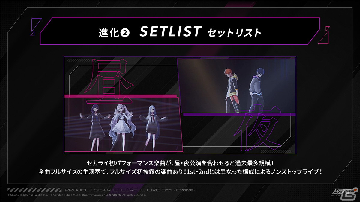 今回は、セカライでの初パフォーマンスとなる楽曲が昼と夜を合わせると過去最多規模となっている。いつも通り全曲フルサイズでの生演奏なので、ここで初めてフルサイズが披露される楽曲もあるという。さらに、ライブ構成も1st・2ndとは違ったノンストップな内容で届けられる。
